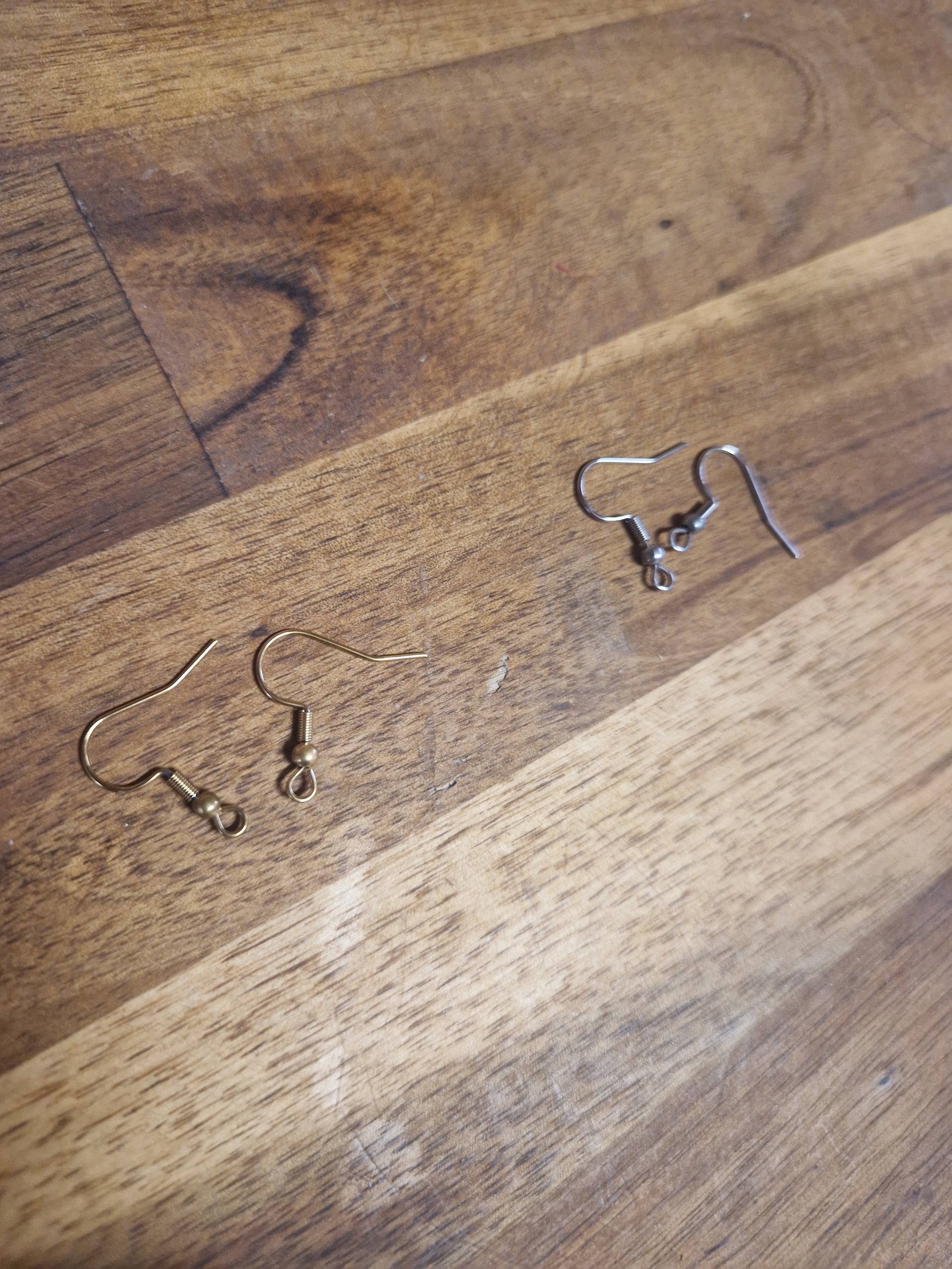Vous pouvez choisir le type d'accroches, crochets (dorés ou argentés), ou créoles (dorées ou argentées, diamètre 2 cm)