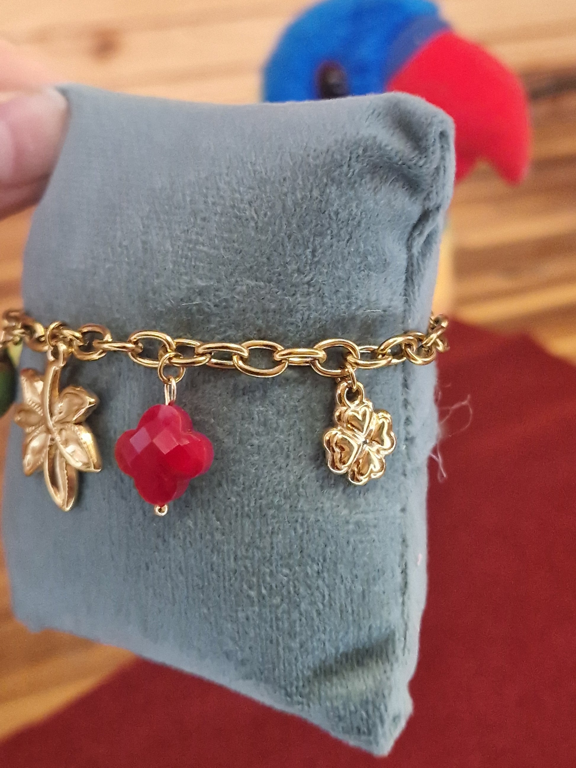 Bracelet réglable sur chaîne agrémenté de breloques cœur et trèfle colorées en résine et de breloques en acier inoxydable (fleur, soleil, trèfle 4 feuilles).