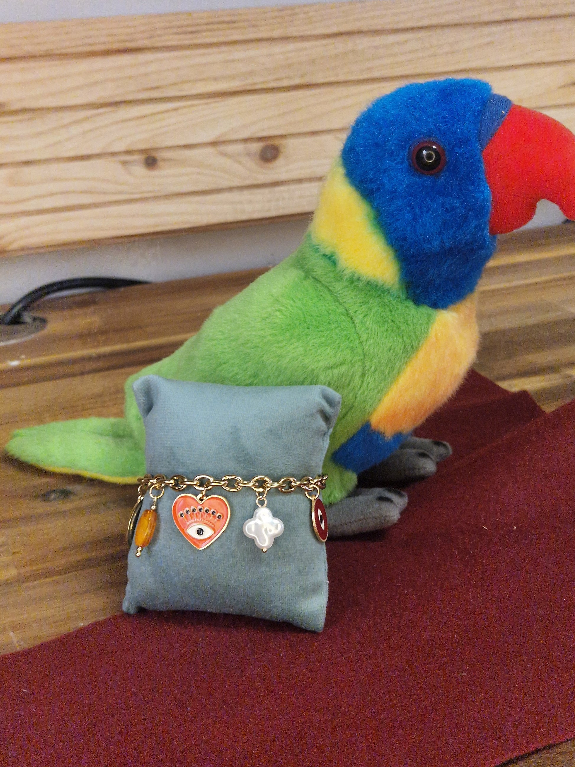 Bracelet réglable sur chaîne agrémenté de breloques colorées de diverses formes en résine ou en acier inoxydable avec parfois des yeux dessinés dessus.