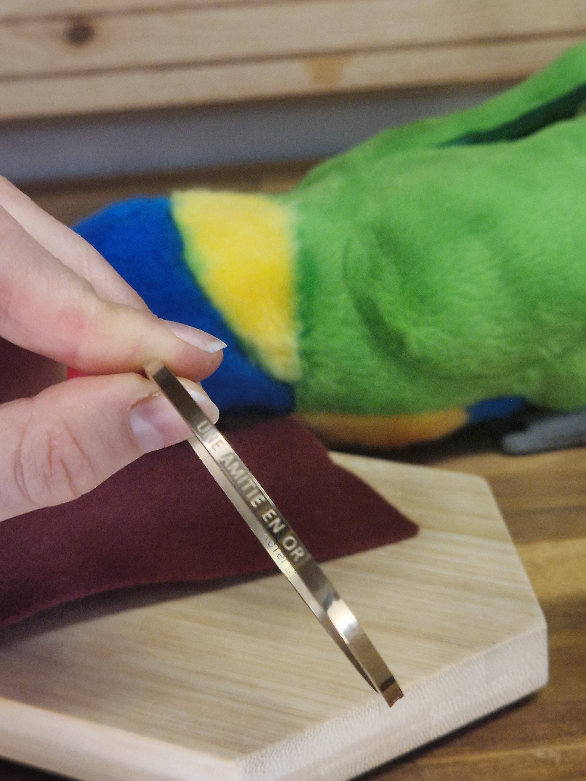 Bracelet jonc rigide avec "Une amitié en or" écrit dessus.