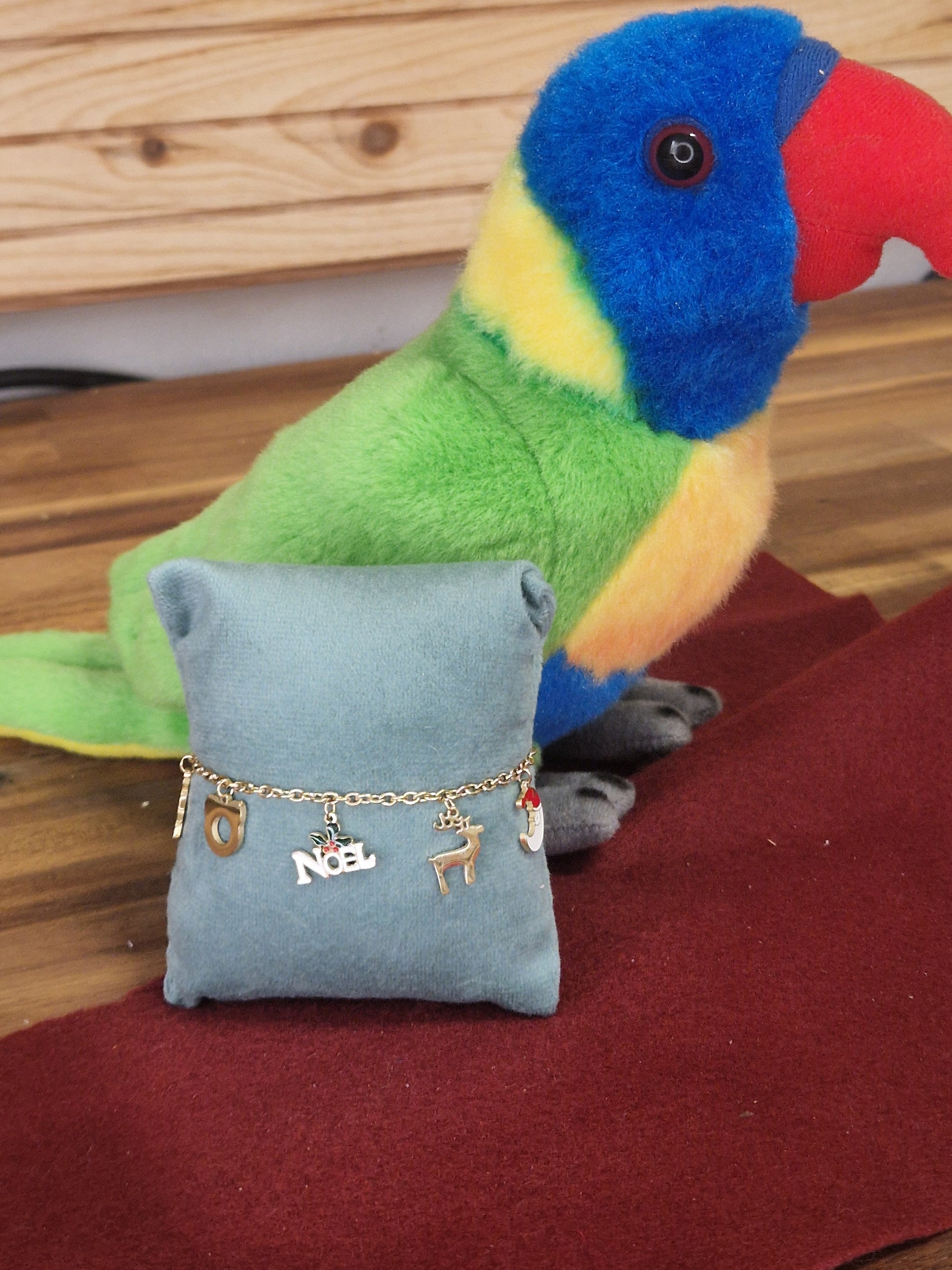 Bracelet réglable sur chaîne agrémenté de breloques évoquant Noël : du houx, couronne de Noël, lune, renne et sapin.
