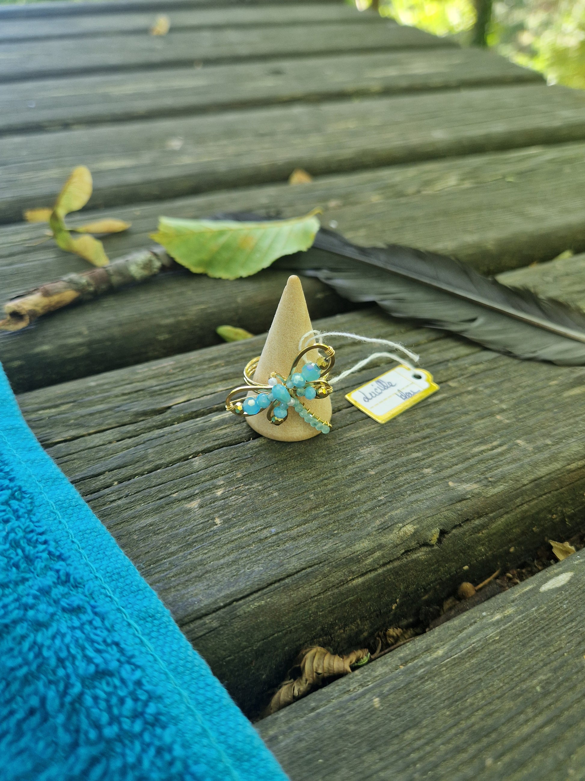Bague graphique ajustable composée d'une libellule constituée de cristaux colorés.