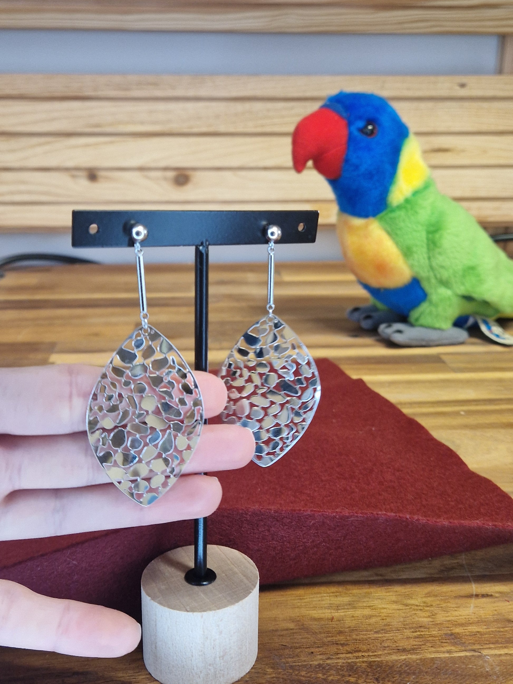 Boucles d'oreilles feuilles ajourées en acier inoxydable.