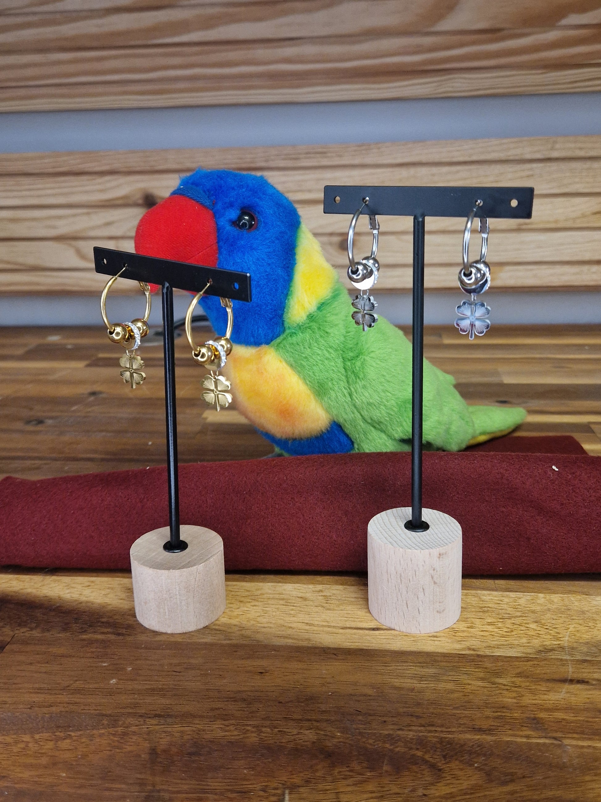 Boucles d'oreilles petites créoles breloques strass et trèfle 4 feuilles en acier inoxydable.