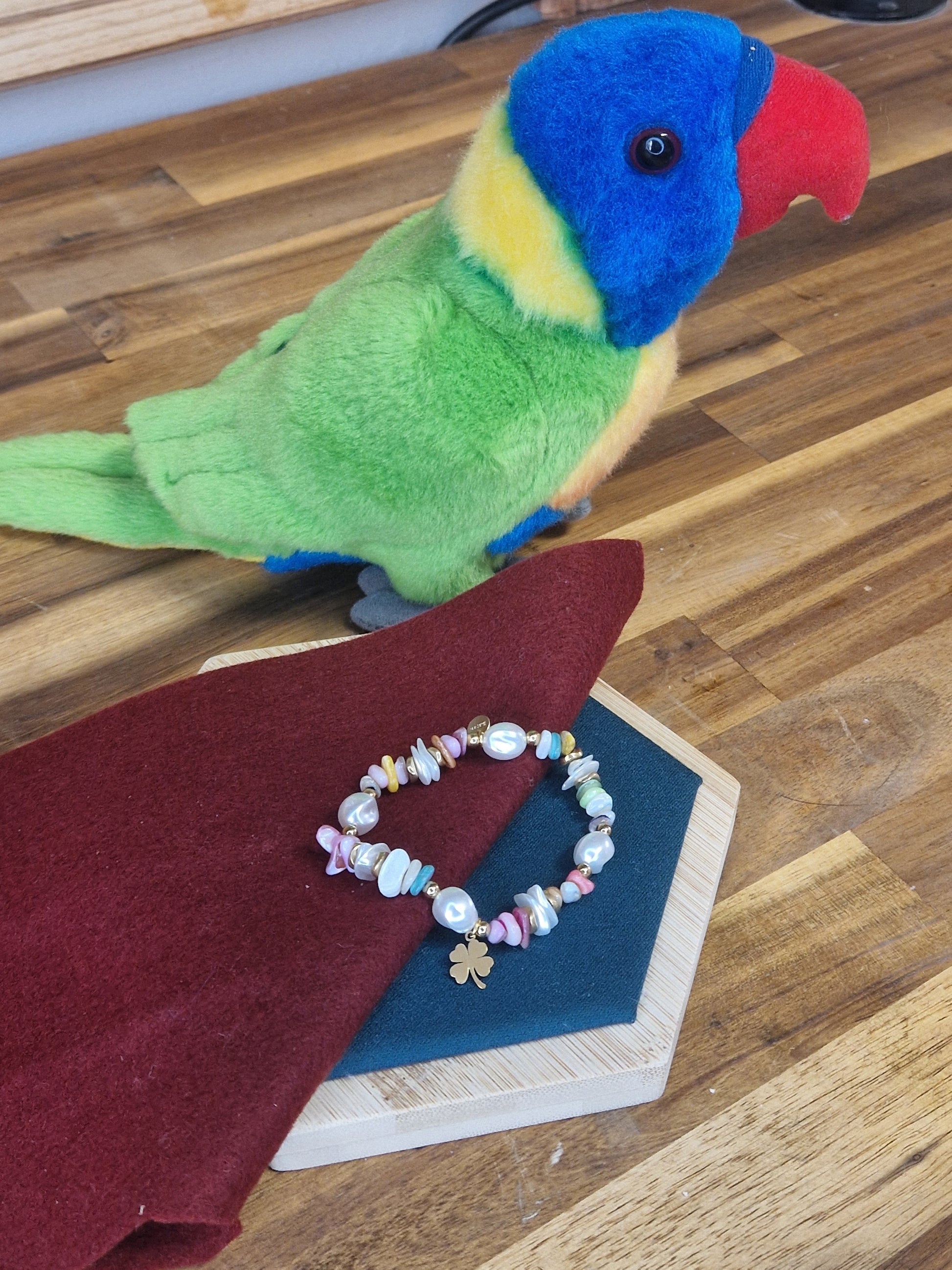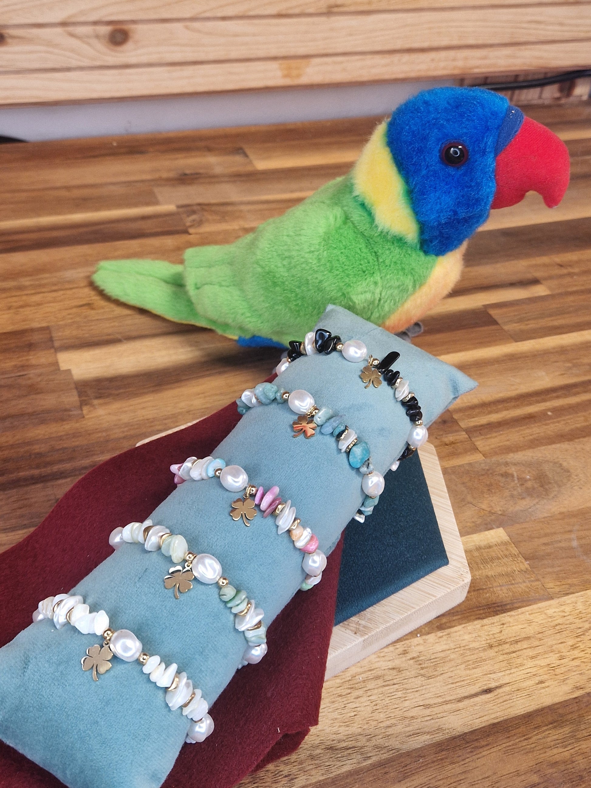 Bracelet élastique avec perles en résine et en acier inoxydable et pendentif trèfle à 4 feuilles.
