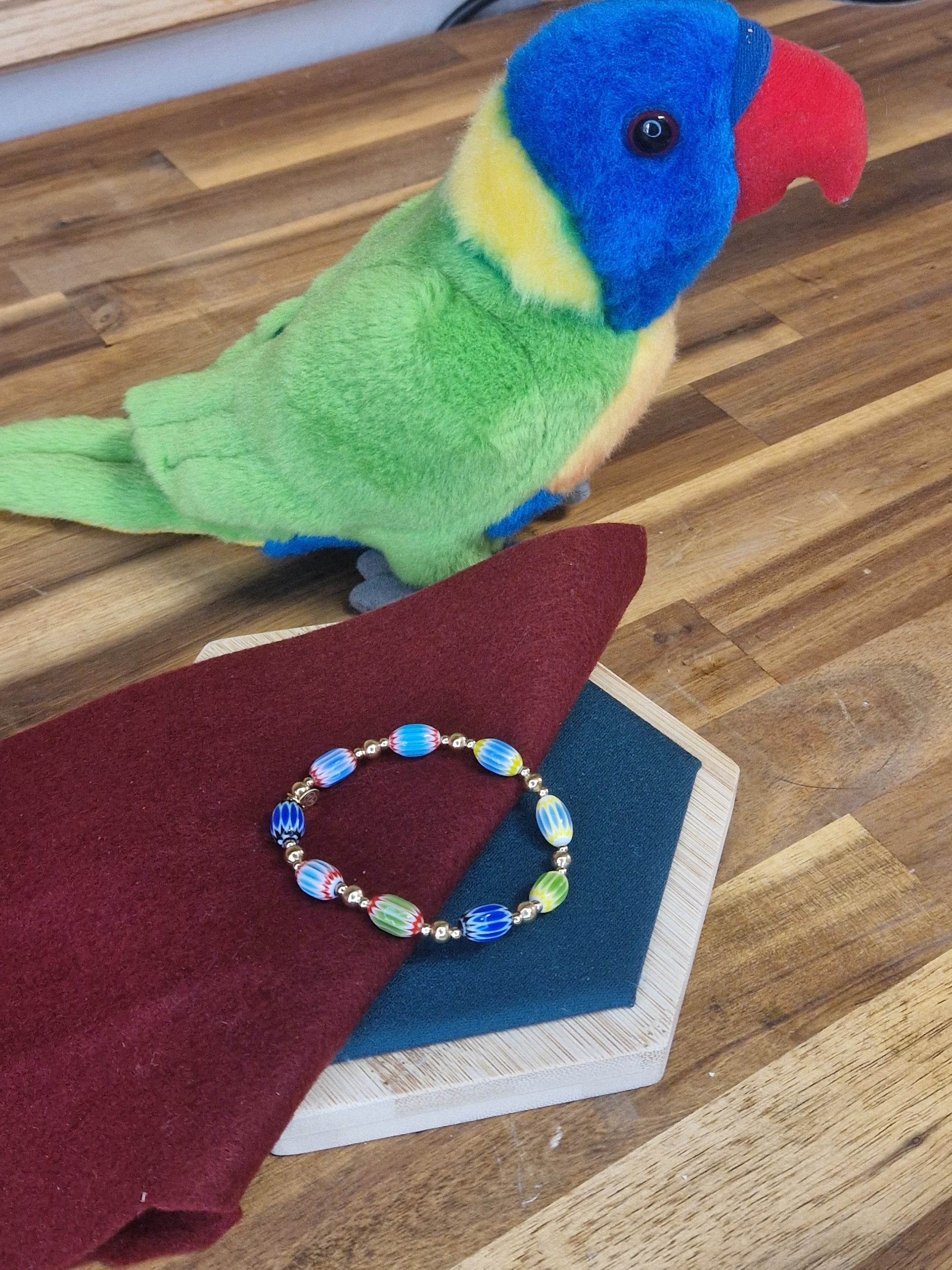 Bracelet élastique avec perles ovales colorées en résine et en acier inoxydable.