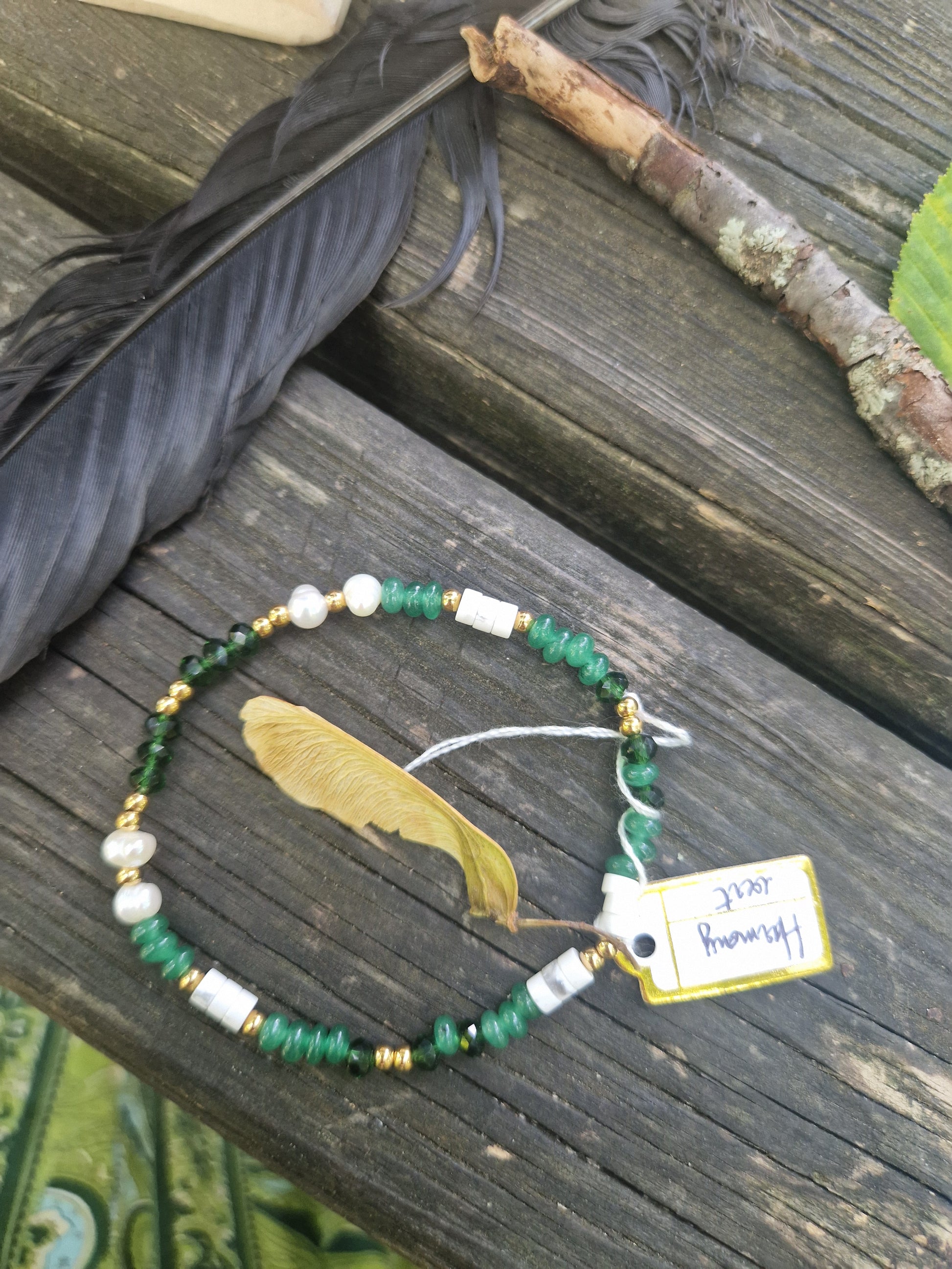Bracelet élastique réglable agrémenté de petits cristaux colorés, de disques de pierre naturelle howlite et de perles d'eau douce.
