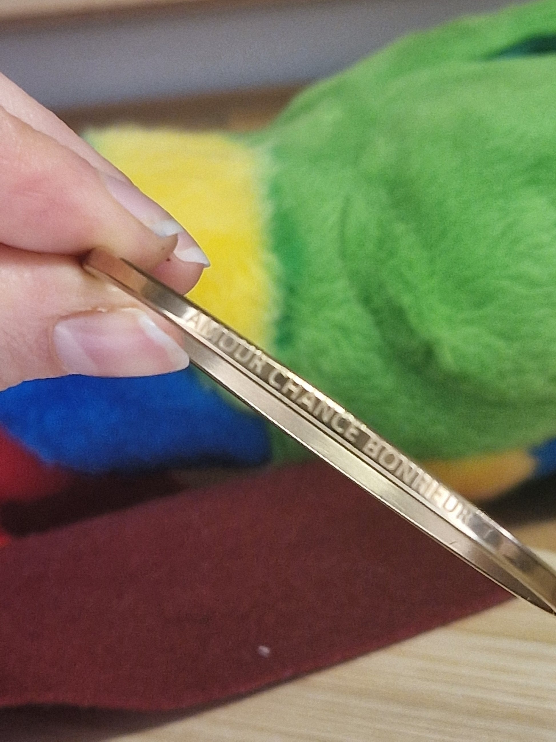 Bracelet jonc rigide avec "Amour chance bonheur" écrit dessus.