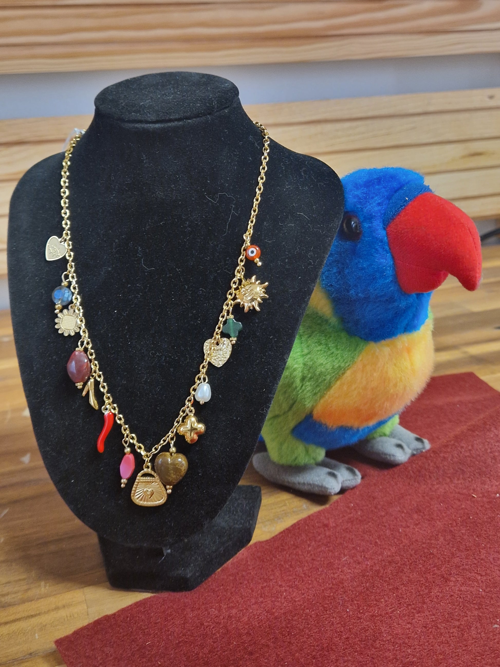 Collier réglable sur chaîne agrémenté d'une perle d'eau douce, de breloques colorées en résine ou en cristal (œil, trèfle, cœur, piment d'Italie) et d'autres en acier inoxydable (sac à main, escarpin, cœur martelé, trèfle, soleil, fleur, cœur avec œil dessiné).