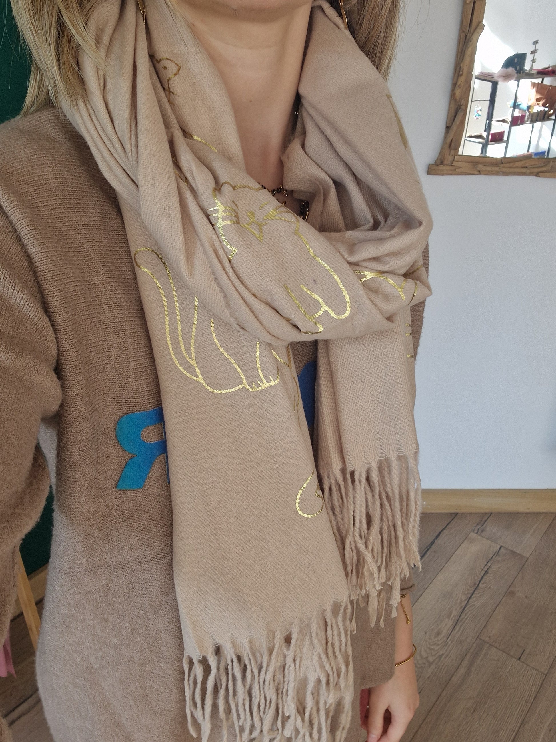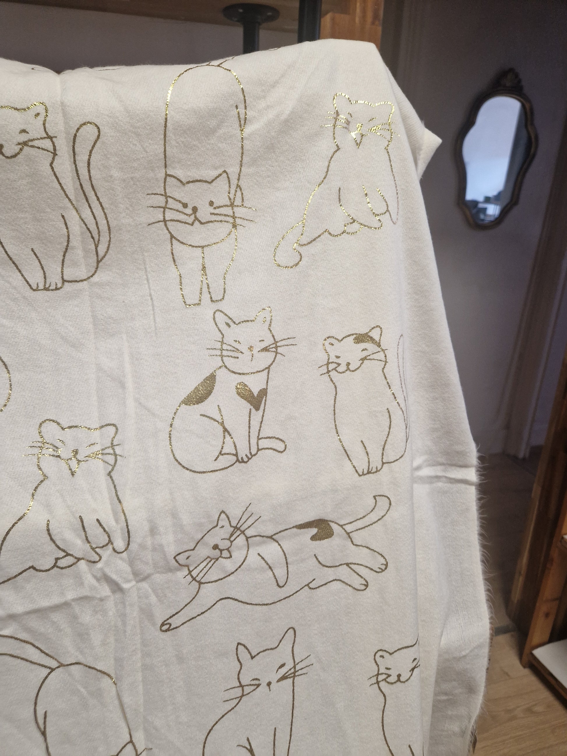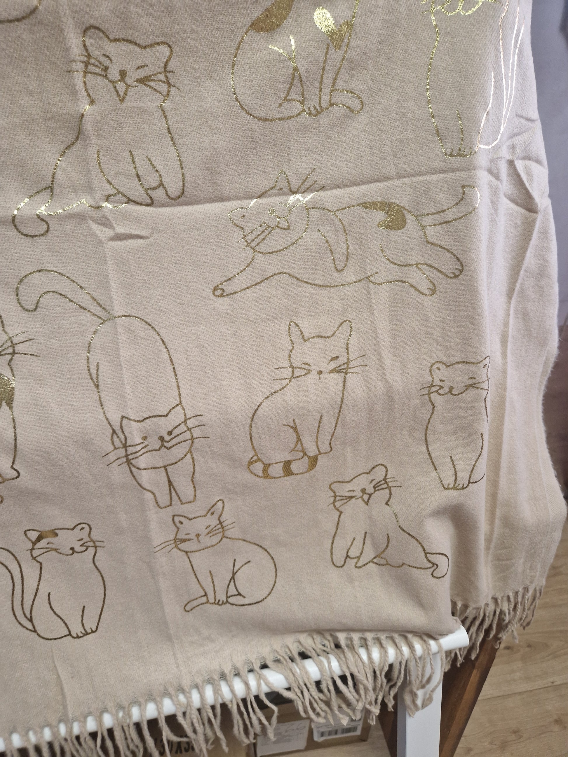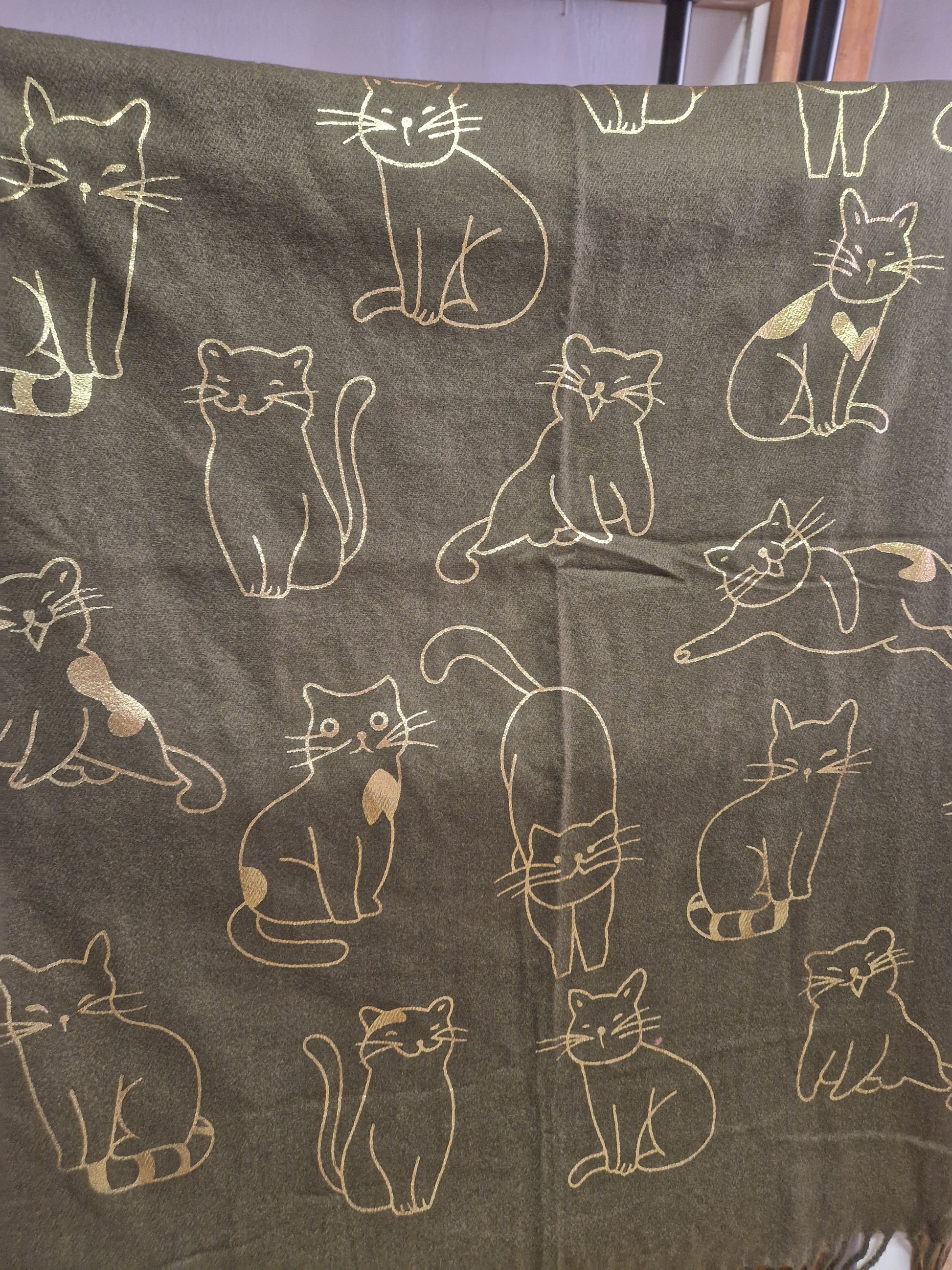Echarpe très douce et chaude, idéale pour les temps froids, avec des motifs chats dorés.