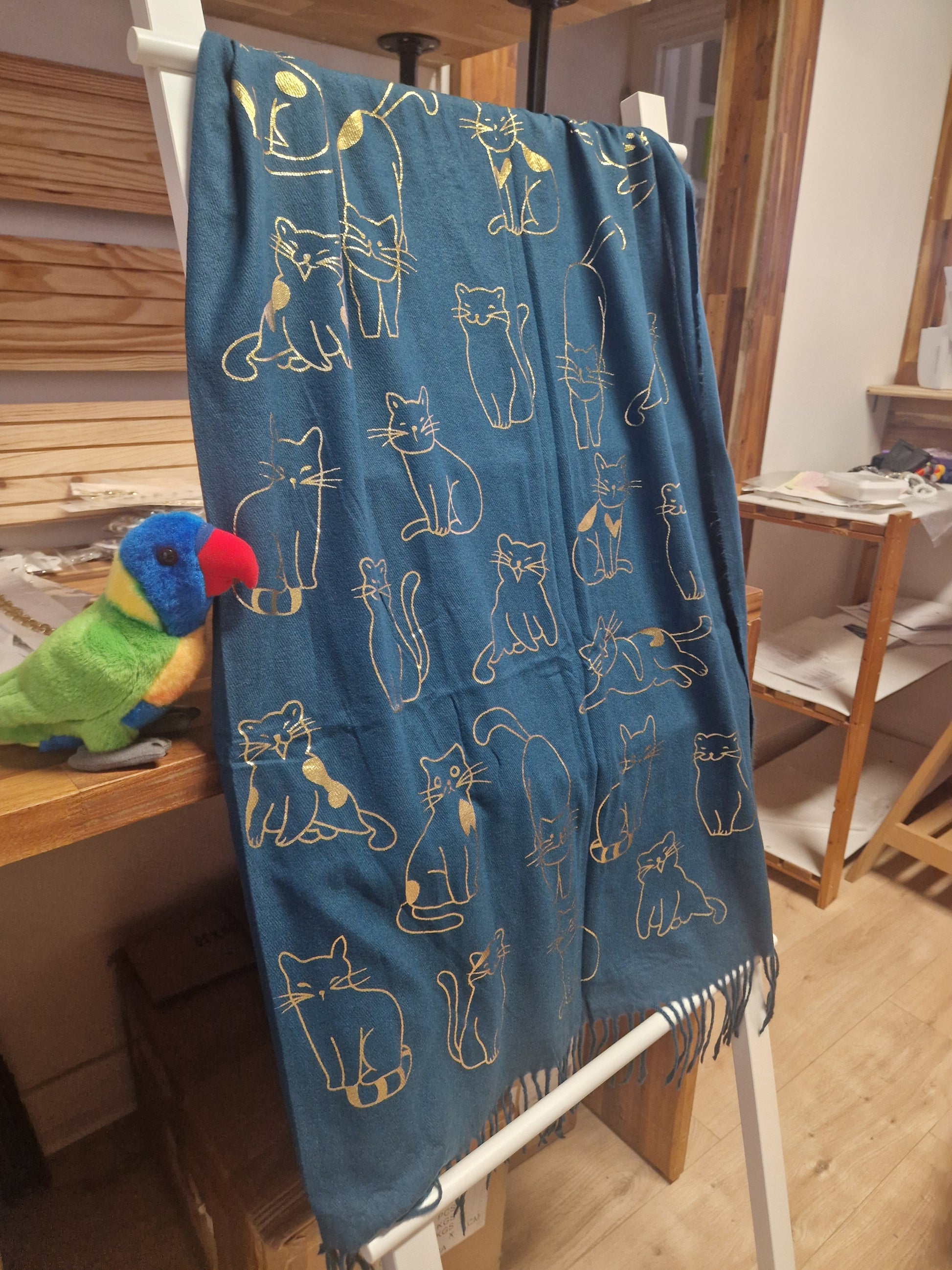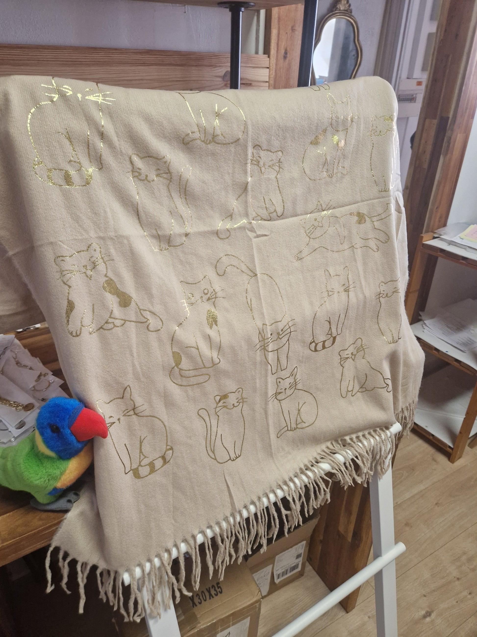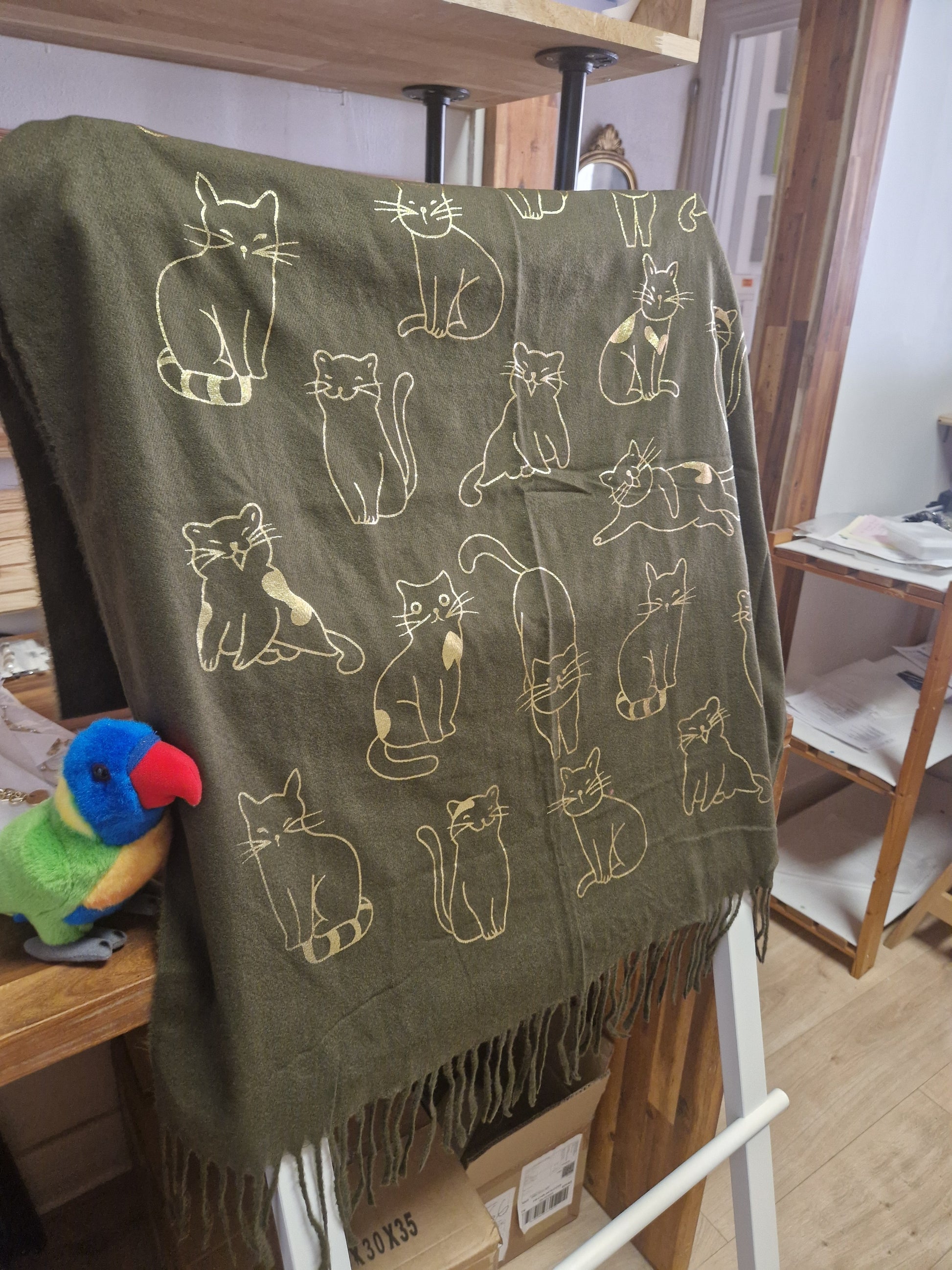 Echarpe très douce et chaude, idéale pour les temps froids, avec des motifs chats dorés.