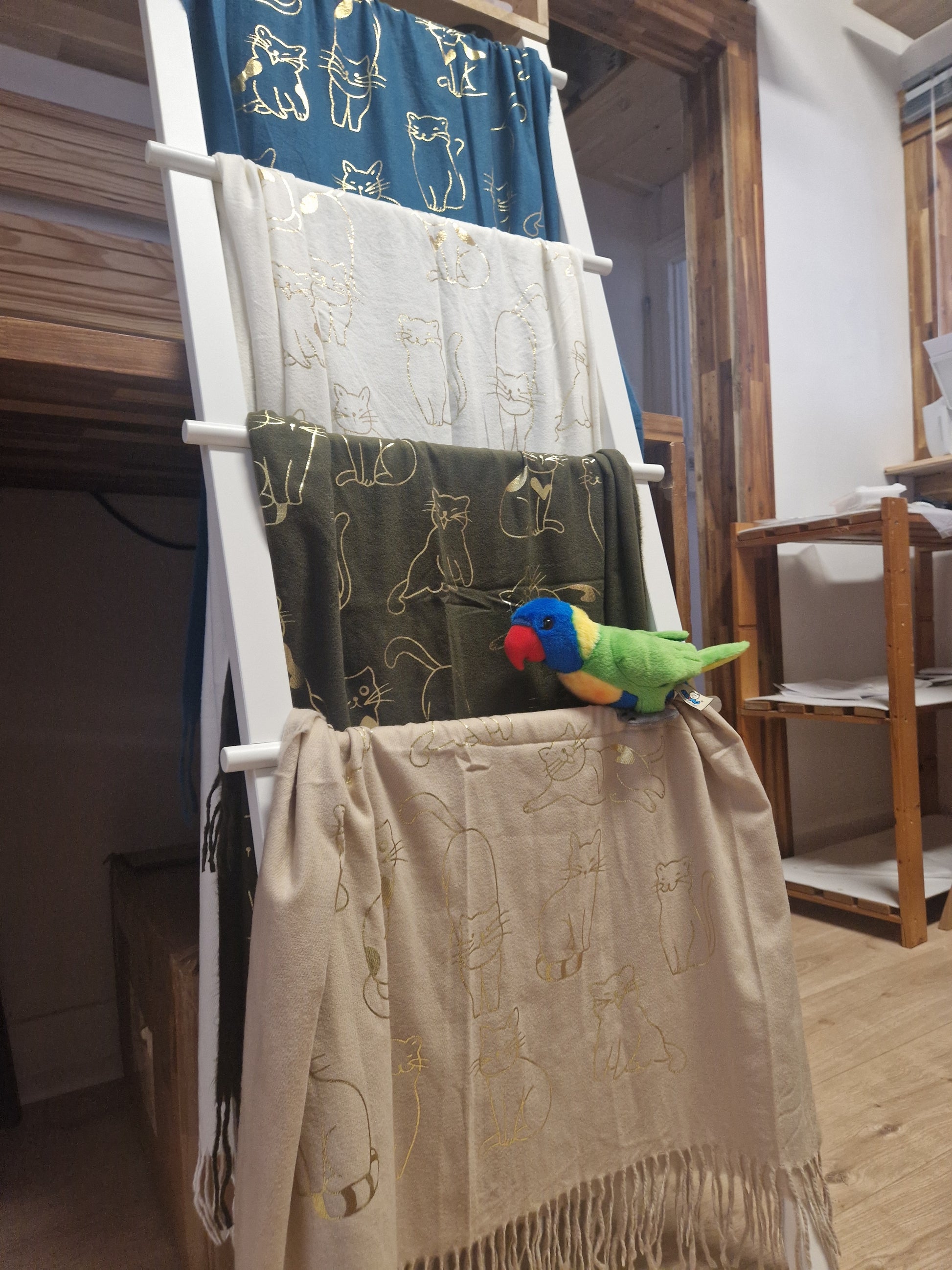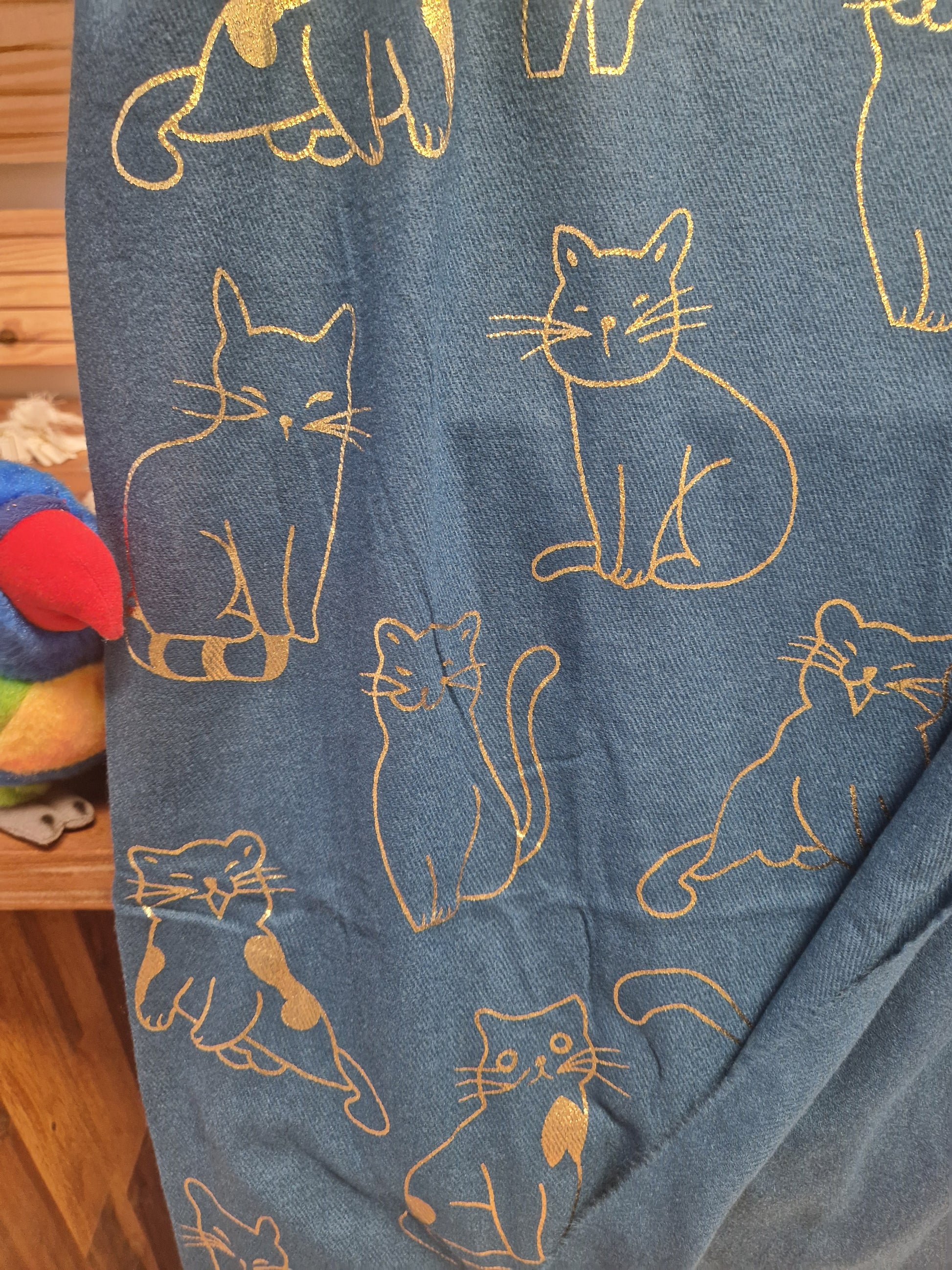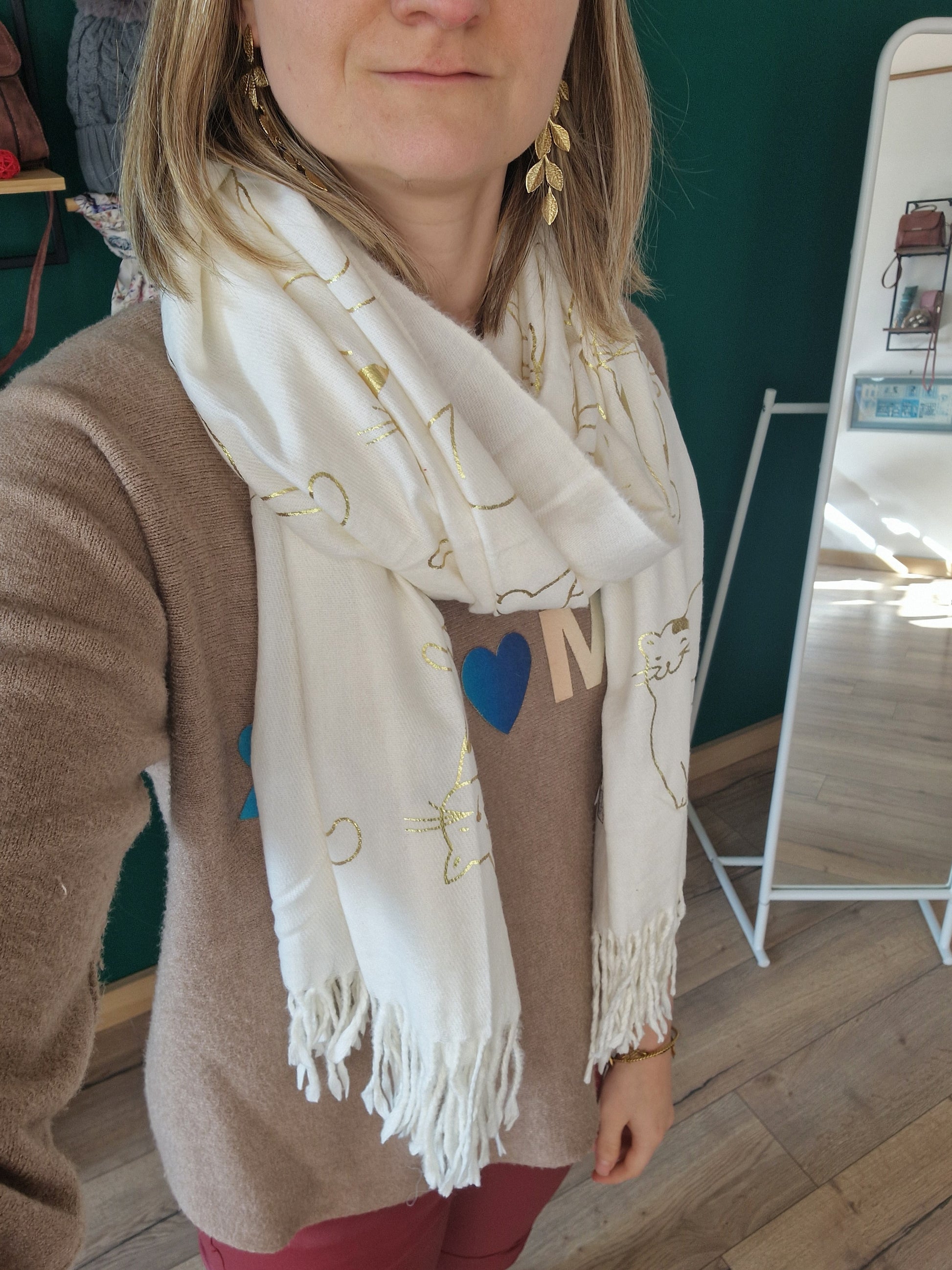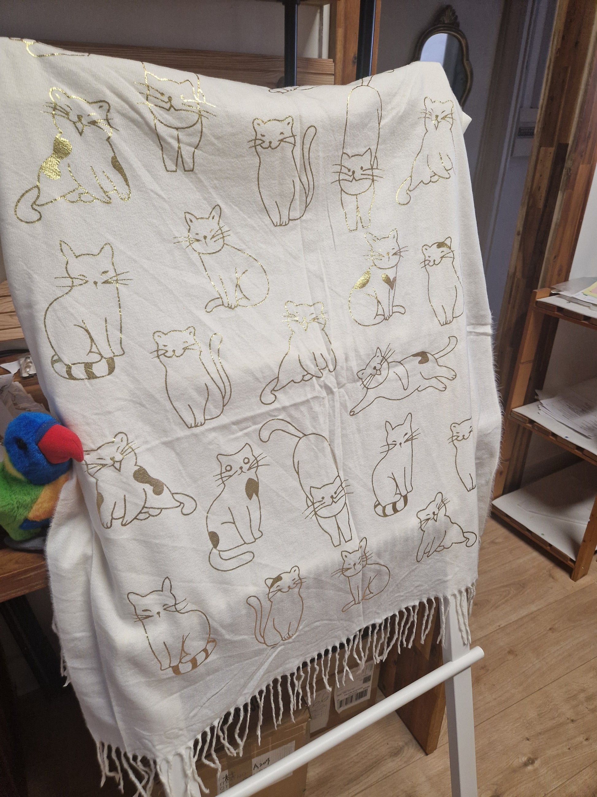 Echarpe très douce et chaude, idéale pour les temps froids, avec des motifs chats dorés.