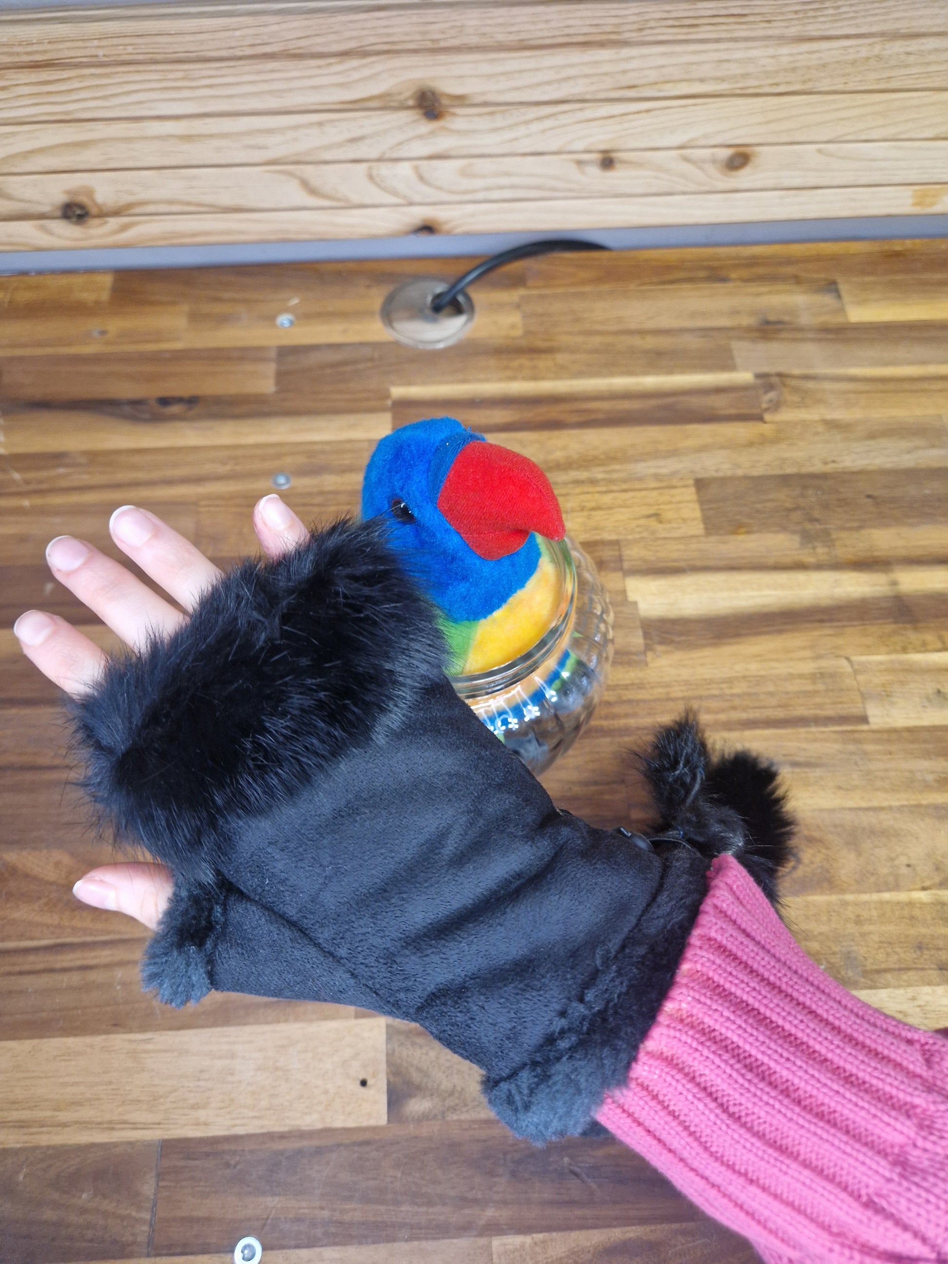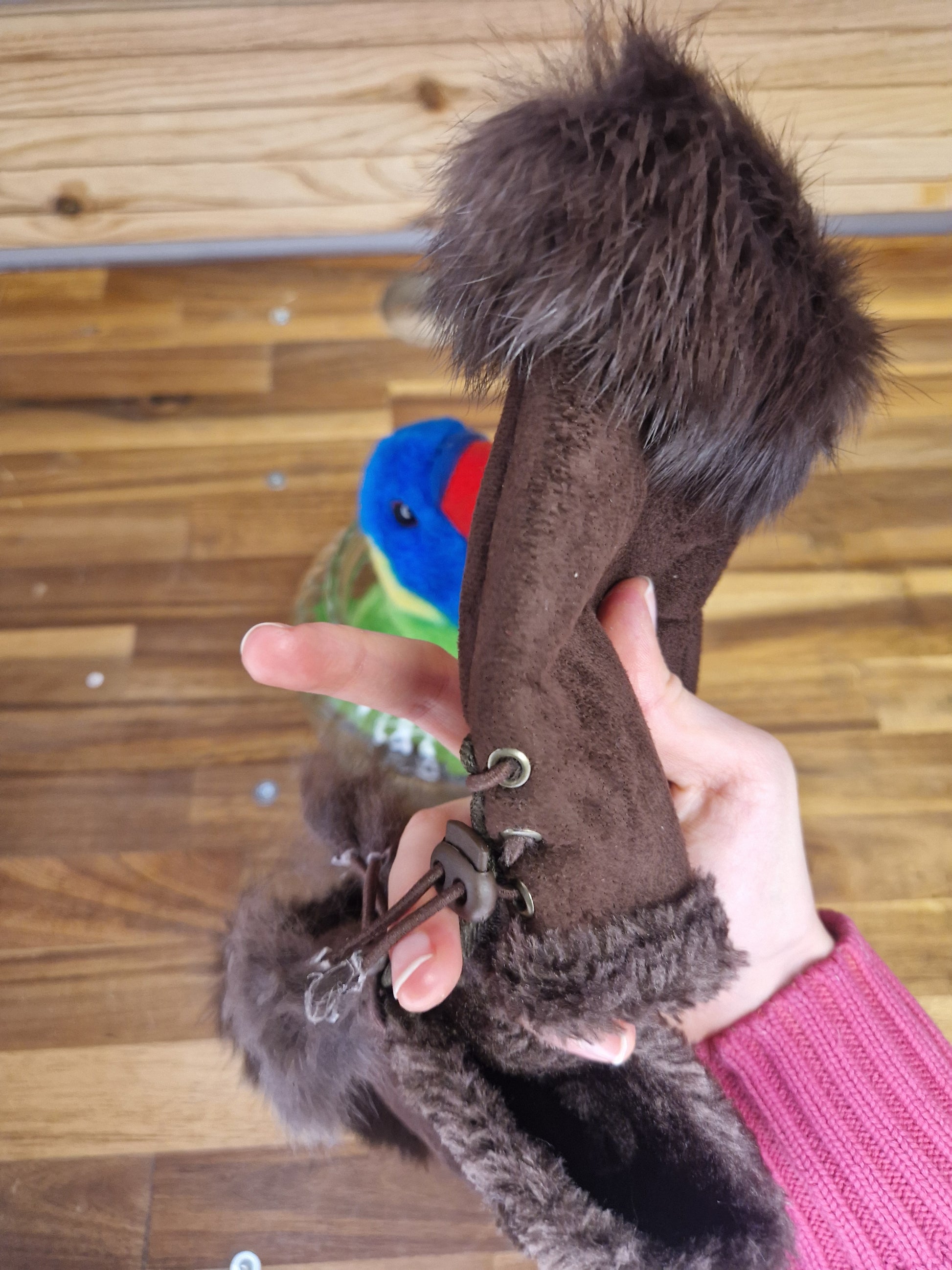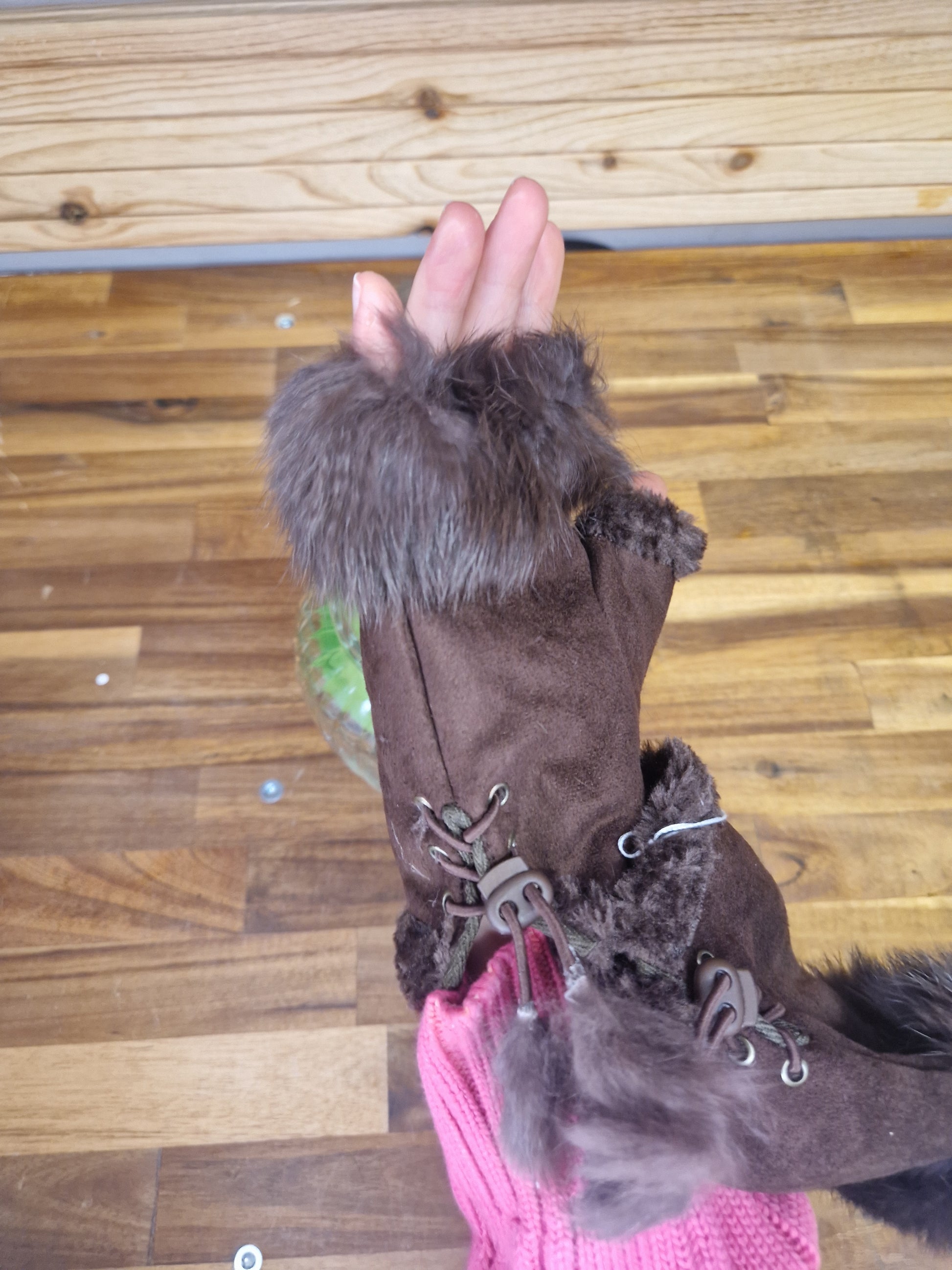 Mitaines avec fourrure synthétique aux extrémités. Laçages sur les côtés pour pouvoir ajuster à son poignet.